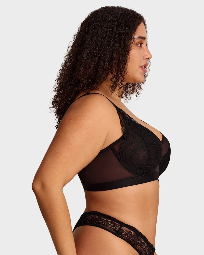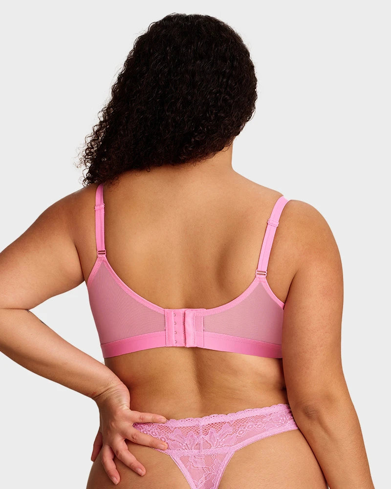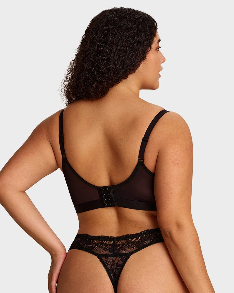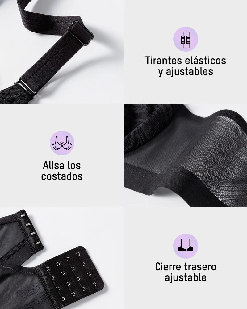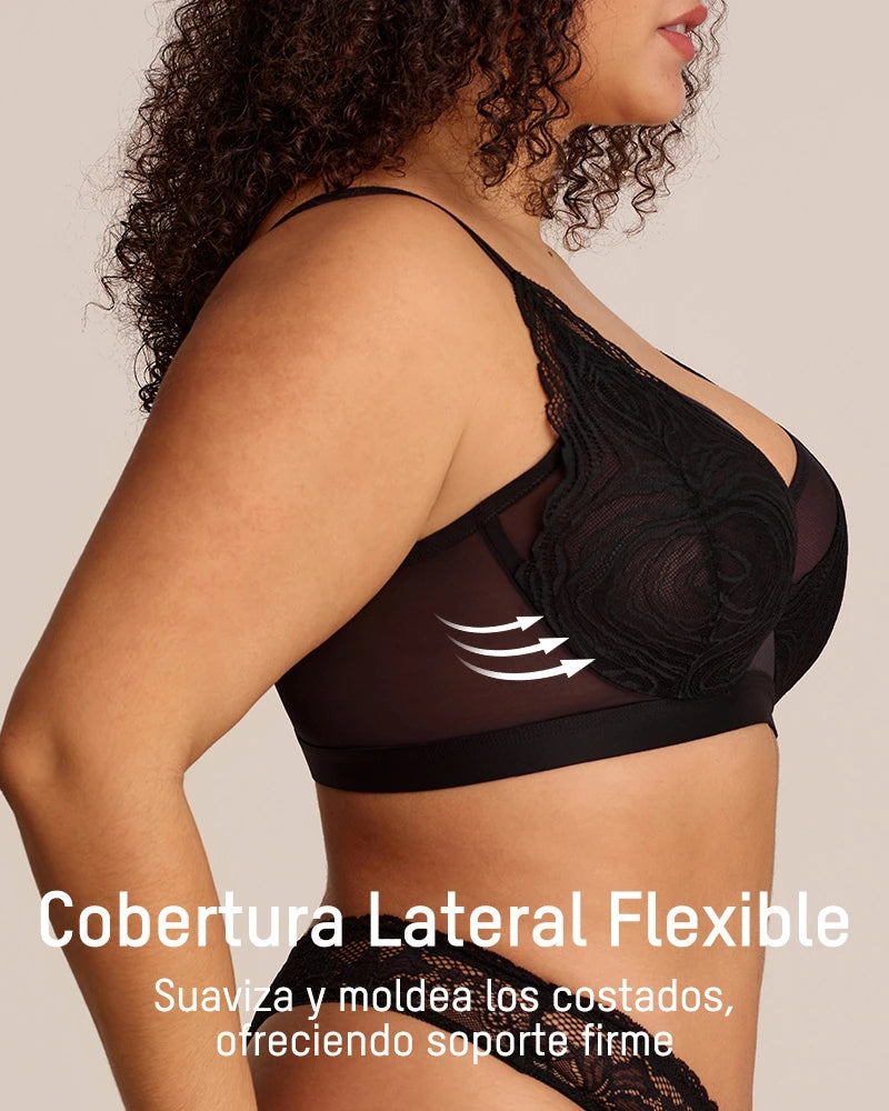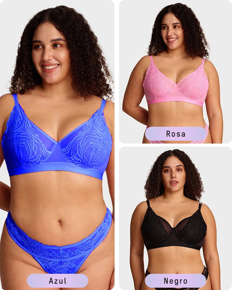 Con delicadas copas de encaje, construcción de malla de doble capa, una amplia banda inferior de soporte y un aro flexible, este sostén equilibra perfectamente estilo y funcionalidad. Levanta, define y brinda soporte de manera natural, mientras los tejidos transpirables te mantienen fresca. Ideal para la confianza diaria o para ocasiones especiales, es la combinación perfecta de elegancia y comodidad.