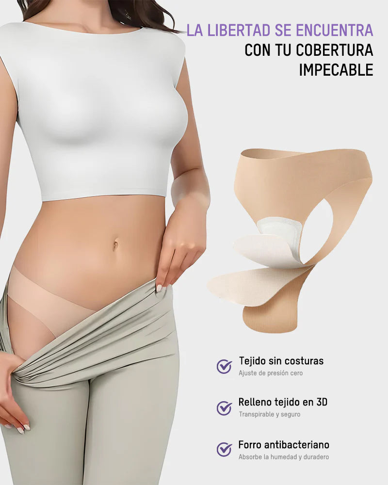 Nuestras tangas innovadoras están diseñadas con una almohadilla integrada que cubre discretamente el área íntima, garantizando máxima discreción incluso bajo los leggings o pantalones de yoga más ajustados. Su diseño seguro y antideslizante mantiene la almohadilla perfectamente en su lugar durante todo el día — sin moverse, sin deslizarse, sin importar cómo te muevas. Desde intensas rutinas en el gimnasio y sesiones de yoga hasta correr, hacer senderismo o nadar, te sentirás apoyada y segura en cada paso.