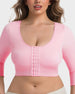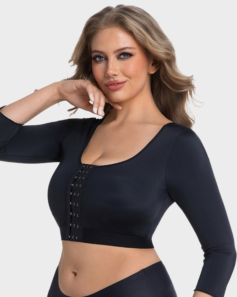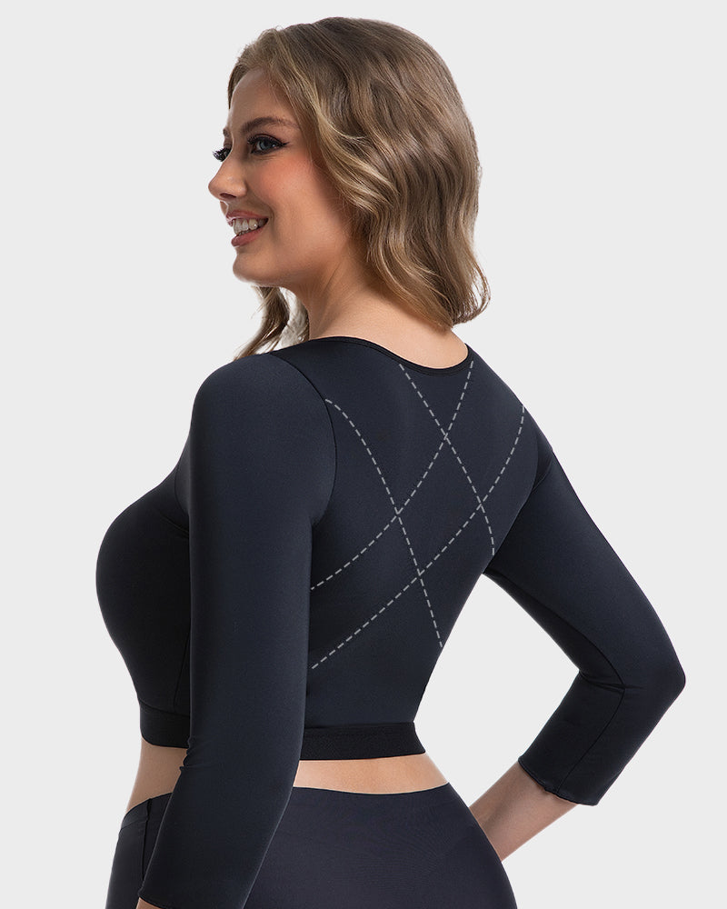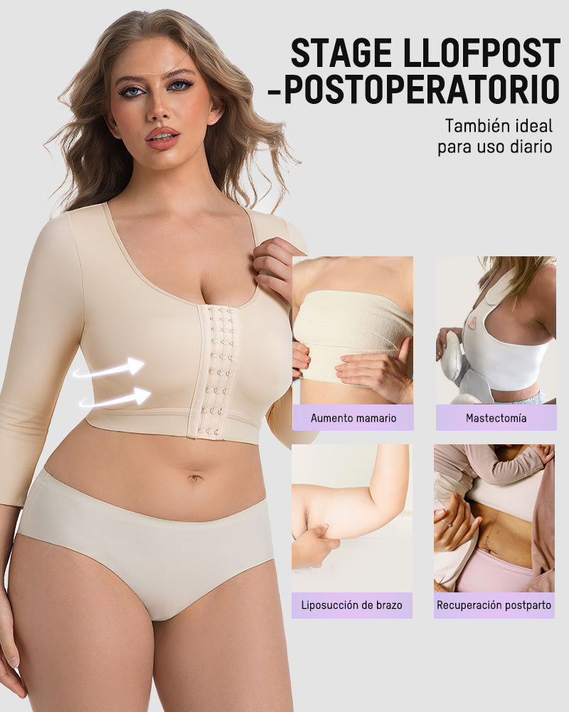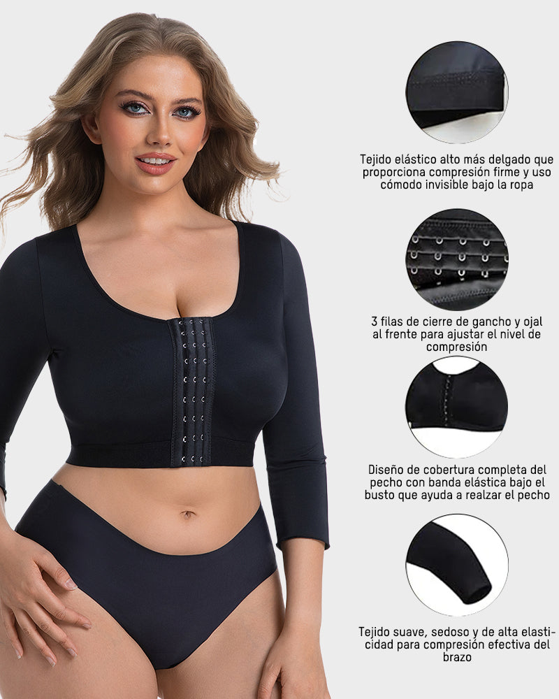 El panel en forma de X en la espalda ayuda a mantener una mejor postura, mientras que las mangas 3/4 con compresión suavizan la flacidez de los brazos. Ideal para moldear a diario o para recuperación postoperatoria.