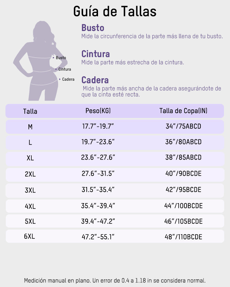 Pedí un talla mediana. Mido 5.2 pies y peso 160 libras. Pensé que era demasiado peque?a cuando la probé por primera vez, pero la abrochó y la cerró con facilidad. No hay sensación de incomodidad. Da una buena silueta. Curva el trasero y las caderas. Mi único problema es la parte del busto. Tengo un pecho de talla 36 C, pero la parte del busto de la prenda es muy peque?a y aplasta los senos de una manera muy poco atractiva.
