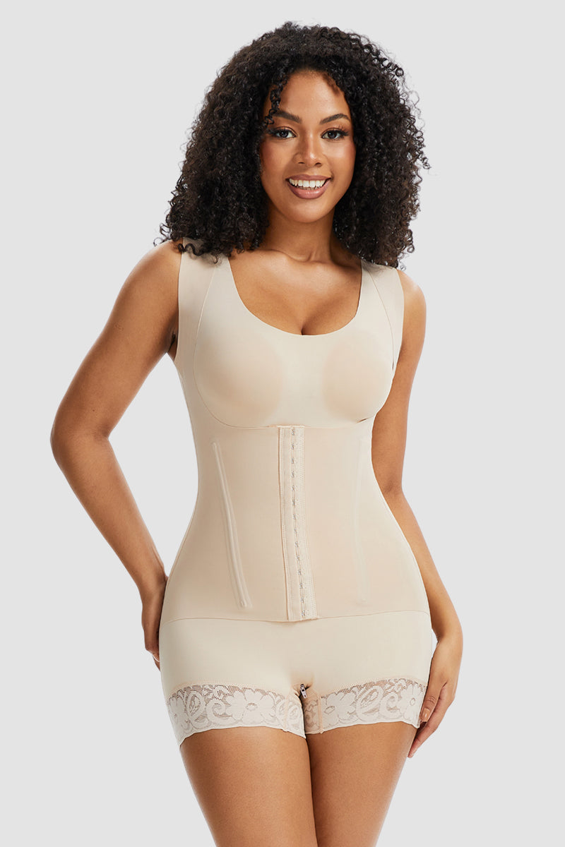 La zona media ciñe suavemente la cintura para una silueta más lisa sin incomodidad. La espalda con corte triangular se ajusta a tus curvas de manera natural, mientras que el cierre de broche en la entrepierna permite un acceso fácil al baño, sin necesidad de desvestirse por completo.