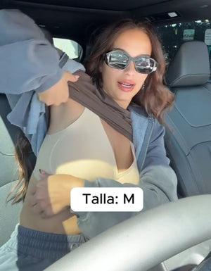 Si bajas una talla → lograrás un escote más marcado y un efecto de realce bajo blusas o vestidos de cuello bajo.